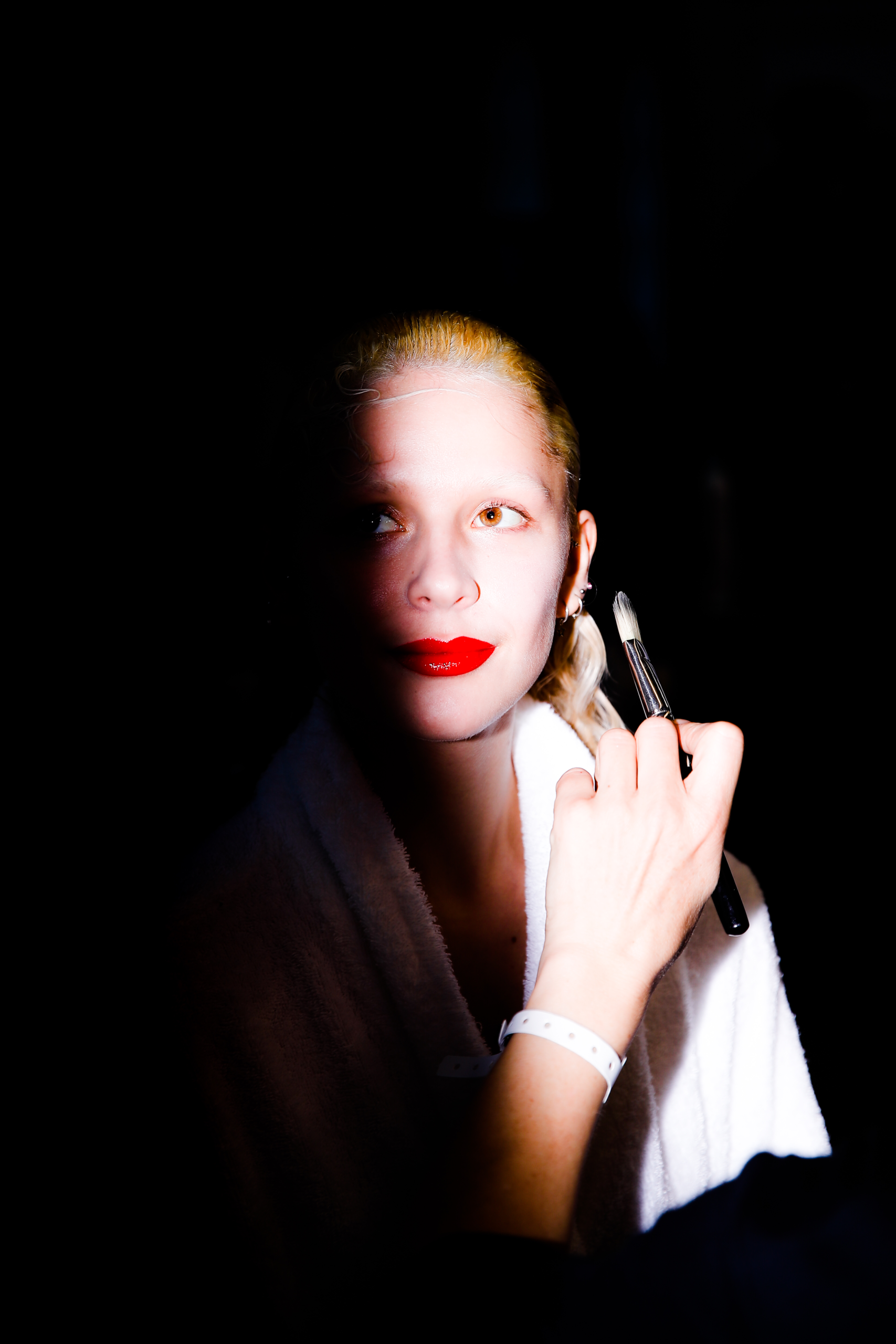 A model Nom – Datewaits to be prepared by a make-up artist moments before the start of the presentation of the creations from Fall/Winter 2023/24 womenswear collection by Patric DiCaprio, Claire Sullivan and Bryn Taubense founders of Vaquera during the Paris Fashion Week, in Paris, France, 27 February 2023. The presentation of the Women’s collections runs from 27 February to 07 March 2023.A model is seen backstage before The Blonds Fall 2023 collection show during New York Fashion Week in New York, New York, USA, 15 February 2023.